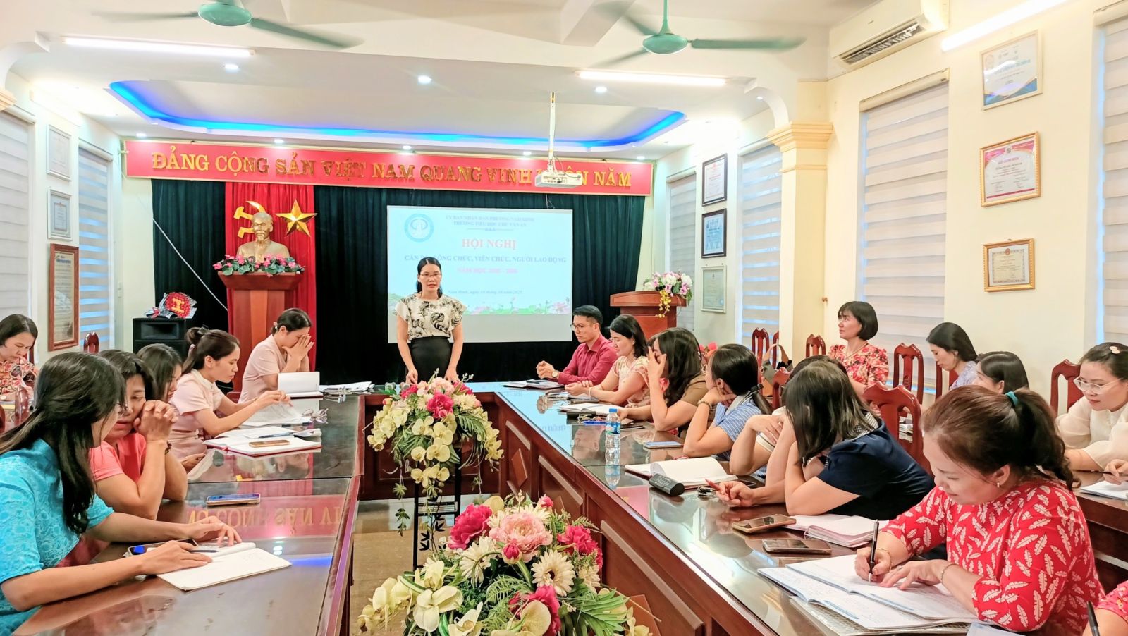 Thực hiện công văn số 01/HD-SGDĐT ngày 25/9/2025 của Sở GD&ĐT và công văn số 03/HD-UBND ngày 29/9/2025 của UBND phường Nam Định về việc hướng dẫn tổ chức Hội nghị cán bộ, công chức viên chức; Hội nghị người lao động năm học 2025-2026. Chiều ngày 10/10/2025, Trường Tiểu học Chu Văn An đã long trọng tổ chức Hội nghị cán bộ, công chức, viên chức và người lao động năm học 2025–2026.Hội nghị được tổ chức nhằm đánh giá khách quan, toàn diện những kết quả đã đạt được trong năm học 2024–2025, đồng thời đề ra phương hướng, nhiệm vụ trọng tâm cho năm học mới. Trong không khí dân chủ, cởi mở, hội nghị đã lắng nghe các báo cáo quan trọng về công tác chuyên môn, thi đua – khen thưởng, tài chính, cũng như các ý kiến thảo luận sôi nổi, thiết thực, thể hiện tâm huyết và tinh thần xây dựng của tập thể cán bộ, giáo viên, nhân viên nhà trường. Các nội dung biểu quyết đều nhận được sự đồng thuận cao, cho thấy tinh thần đoàn kết và quyết tâm chung của tập thể nhà trường trong việc thực hiện nhiệm vụ năm học mới.